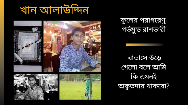 কবি পরিচিতি: খান আলাউদ্দিন জন্ম: ৯ ফেব্রুয়ারি ১৯৯৭, রবিবার। কাপাসিয়া, গাজীপুর। পড়াশোনা: বিজ্ঞান, মানবিক, ইংরেজি ভাষা ও সাহিত্য। প্রকাশিত কবিতার বই: ভার্চুয়াল রিয়েলিটি ডিসঅর্ডার। চৈতন্য, বইমেলা ২০২১।